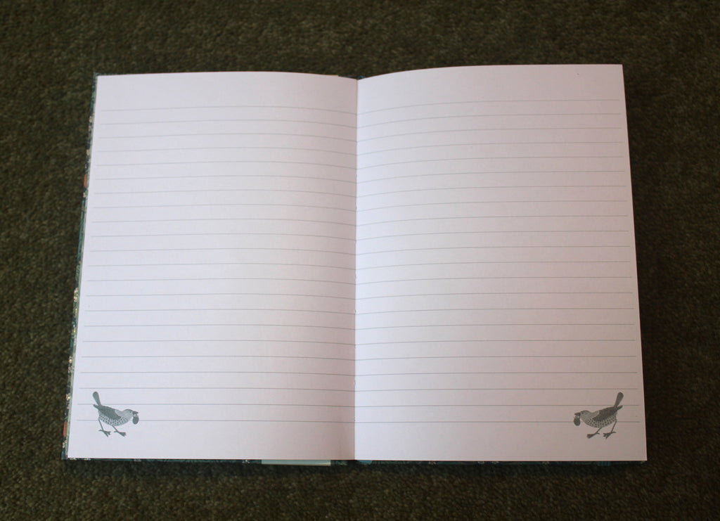 - 1 x Morris & Co. A5 notebook with the Blackthorn design on the cover, 192 lined pages, 100 gsm acid free paper, lay flat binding, elastic strap and ribbon bookmark. Each page has a bird from the Strawberry Thief design in the lower corner