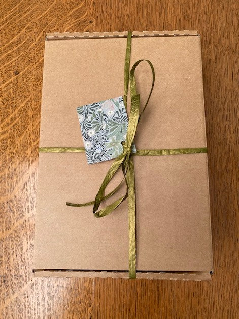 Gift packaging box is wrapped with gold raffia ribbon and a gift tag featuring a Morris design.
