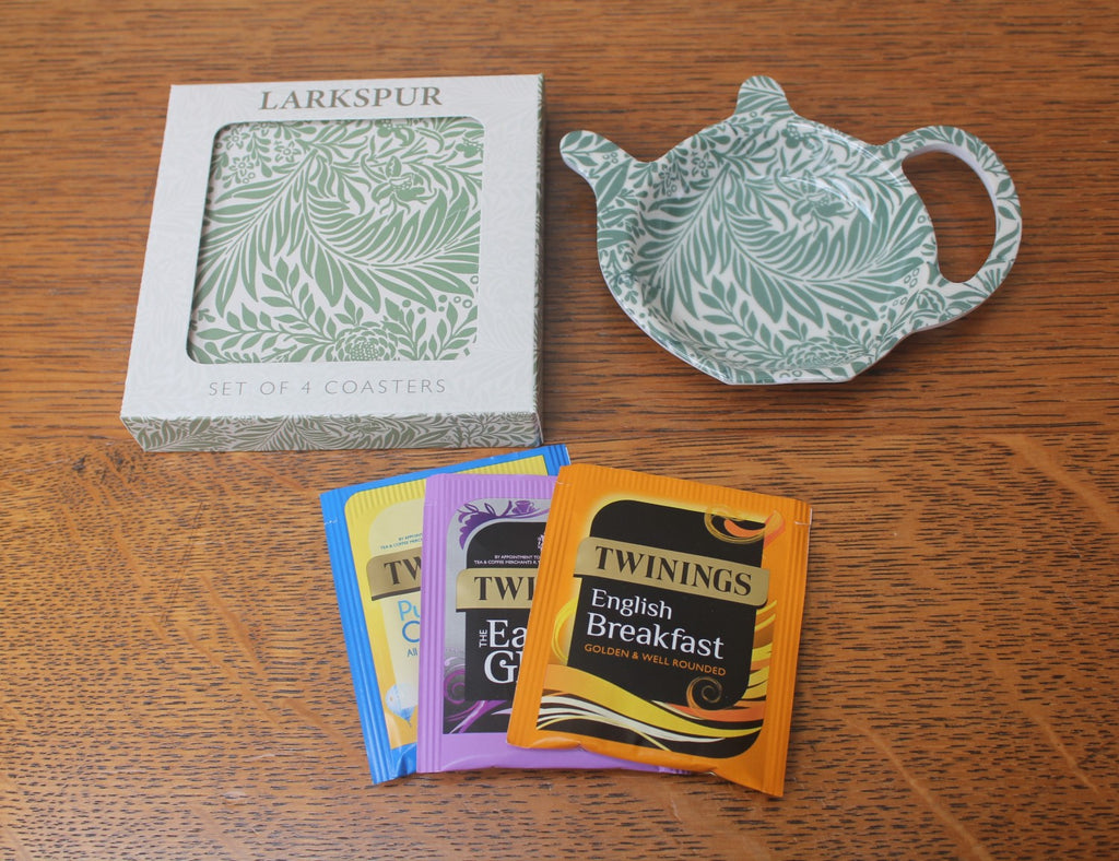 The perfect gift for an admirer of William Morris who loves tea! Beautiful gift set featuring the Larkspur design on a set of 2 fine china mugs, tea bag tidy and 4 coasters complete with 3 Twinings enveloped tea bags. Presented in a gift box wrapped with gold raffia ribbon and a Morris design gift tag ready for your message.