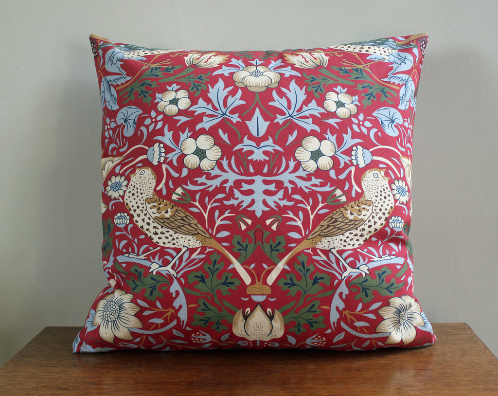 100% cotton cushion cover - just cover no inner pad - with zip opening featuring the Strawberry Thief design by William Morris in a red colourway Design on both sides of the cover. Features the brown feathered birds in the design rather than the birds with strawberries.
